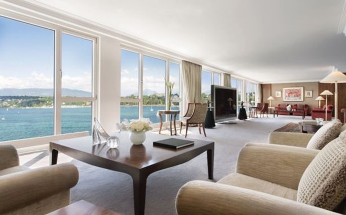 Hotel President Wilson Royal Penthouse Suite in Switzerland is located on the entire top floor of the hotel, offering a panoramic terrace with breathtaking views over Lake Geneva.