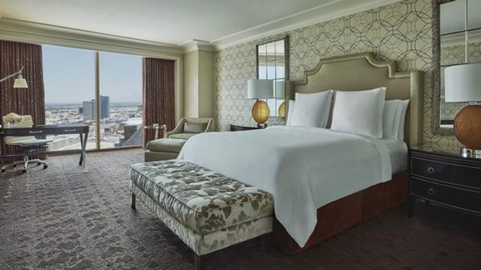This Five Diamond rated hotel has a prime location on the Las Vegas Strip and has floor-to-ceiling windows with mountain or street views.