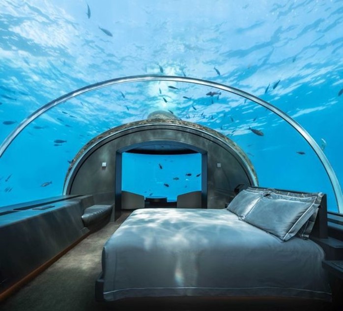 Coming in at $50,000 a night, the hotel is two stories tall, with the bottom story being roughly 16 feet below the Indian Ocean.